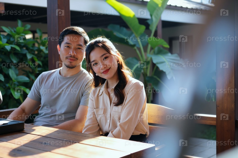 Молодой азиатский мужчина и женщина улыбаются и отдыхают вместе на свежем воздухе