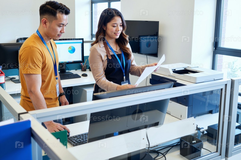 Молодая азиатская женщина и молодой азиатский мужчина сотрудничают в современном офисном рабочем пространстве