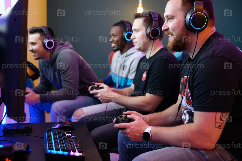 Мультиэтнические молодые взрослые мужчины, участвующие в турнире по видеоиграм на крыше