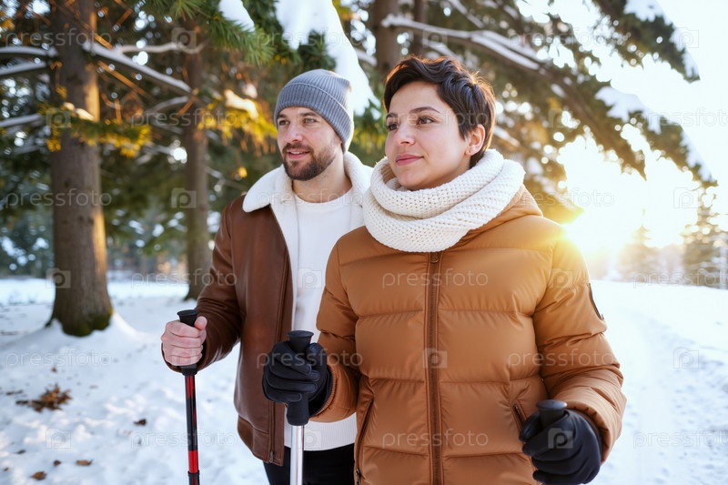 Молодой белый мужчина и женщина ходят со лыжными столбами в снежном лесу