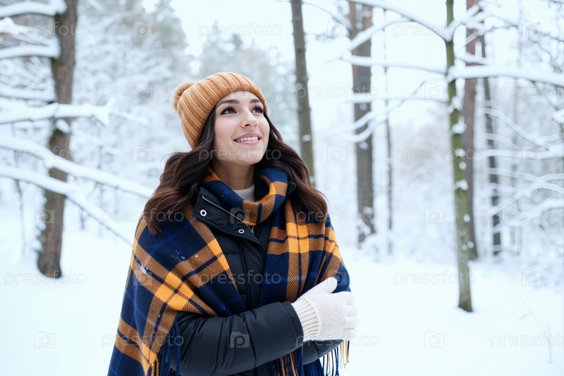 Портрет молодой взрослой белокожей женщины, улыбающейся на улице зимой