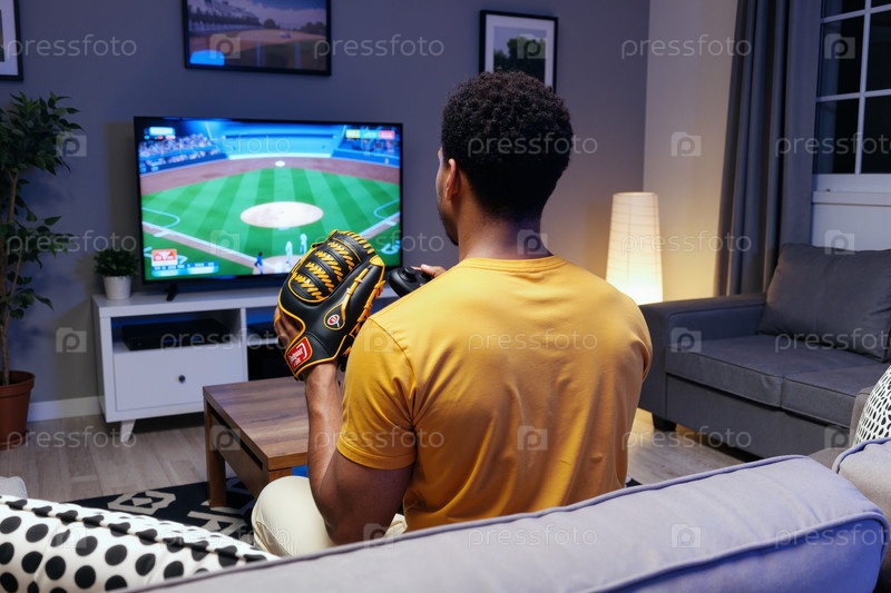 Молодой взрослый чернокожий мужчина играет в бейсбольную видеоигру в современной гостиной