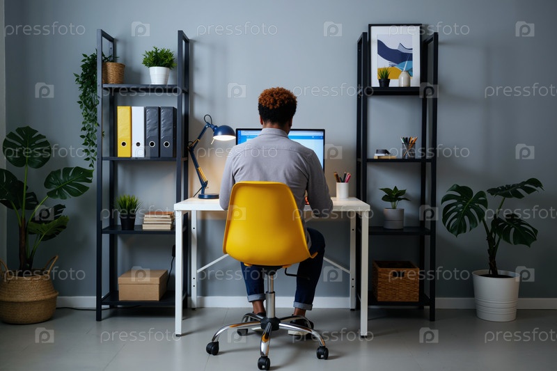 Молодой взрослый чернокожий мужчина работает на компьютере в современной домашней конторе