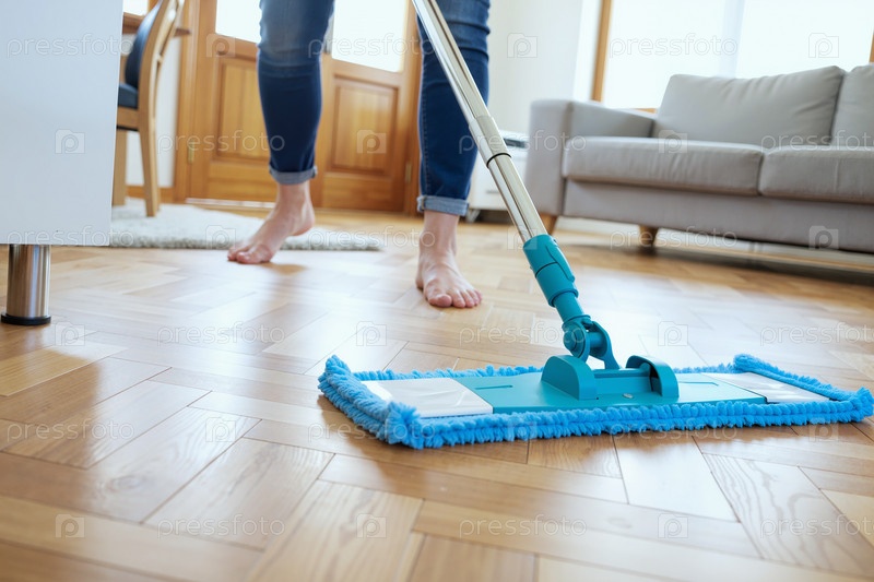 Женщина, убирающая напольный пол из древесины с мопом в гостиной