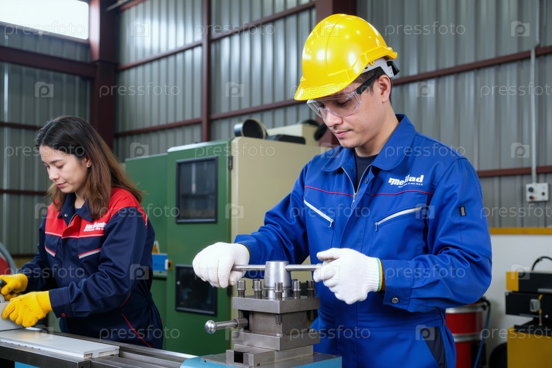 Молодой азиатский мужчина управляет машиной, в то время как молодая азиатская женщина работает на фабрике