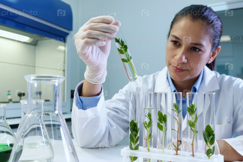 Молодая взрослая кавказская женщина изучает образцы растений в научной лаборатории