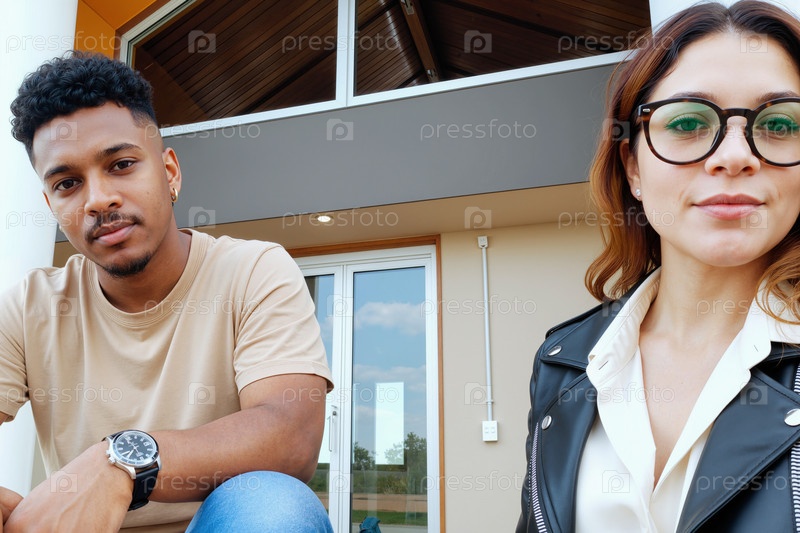 Молодая кавказская женщина и молодой чернокожий мужчина сидят вместе на улице, улыбаясь