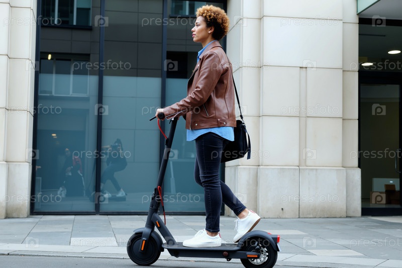 Молодая взрослая женщина едет на электрическом скутере вдоль городской тротуара