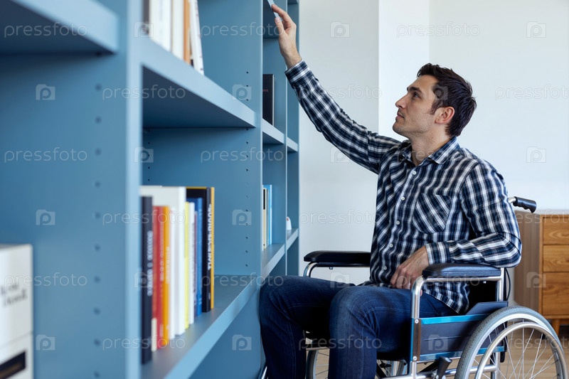 Кавказский молодой взрослый мужчина в инвалидном кресле ищет книгу на книжной полке