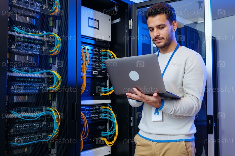 Молодой Кавказский мужчина управляет серверным оборудованием в современном центре обработки данных