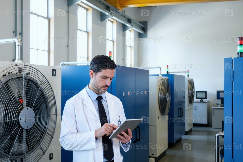 Кавказский молодой взрослый мужчина использует цифровой планшет в условиях промышленной лаборатории