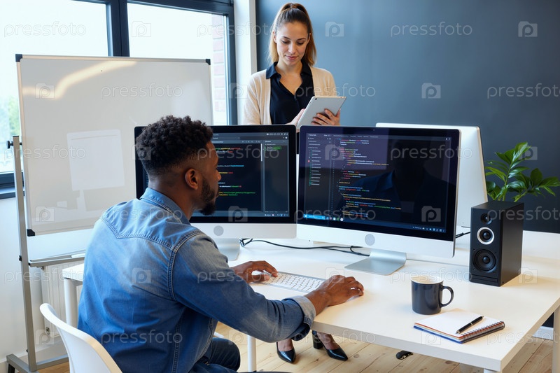 Молодая кавказская женщина контролирует чёрного человека, кодирующего программное обеспечение в современном офисе