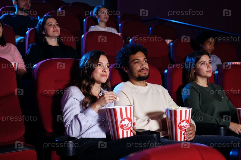 Молодые взрослые смотрят фильм в кинотеатре и едят попкорн вместе