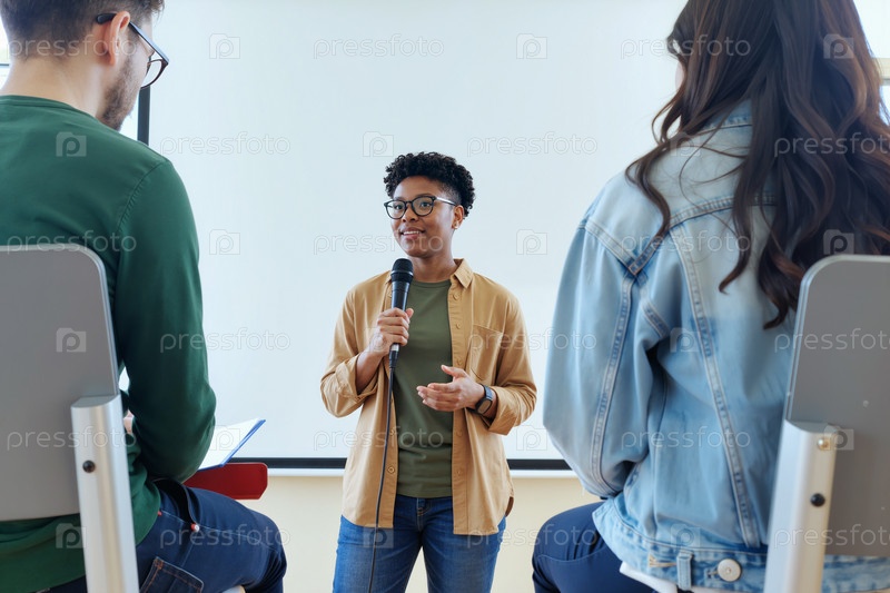 Молодая взрослая чернокожая женщина говорит уверенно во время групповой презентации