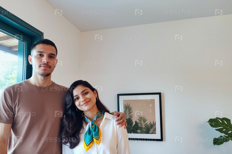 Молодой латиноамериканский мужчина обнимает улыбающуюся молодую испаноязычную женщину в помещении