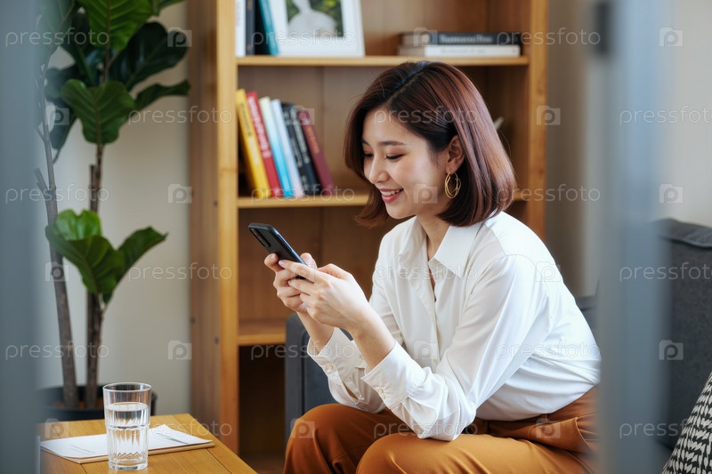 Молодая взрослая азиатская женщина улыбается, используя смартфон в современной гостиной
