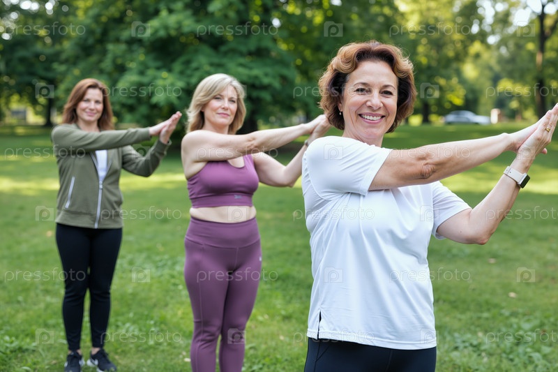 Группа белых женщин среднего возраста, занимающихся вместе на открытом воздухе в парке