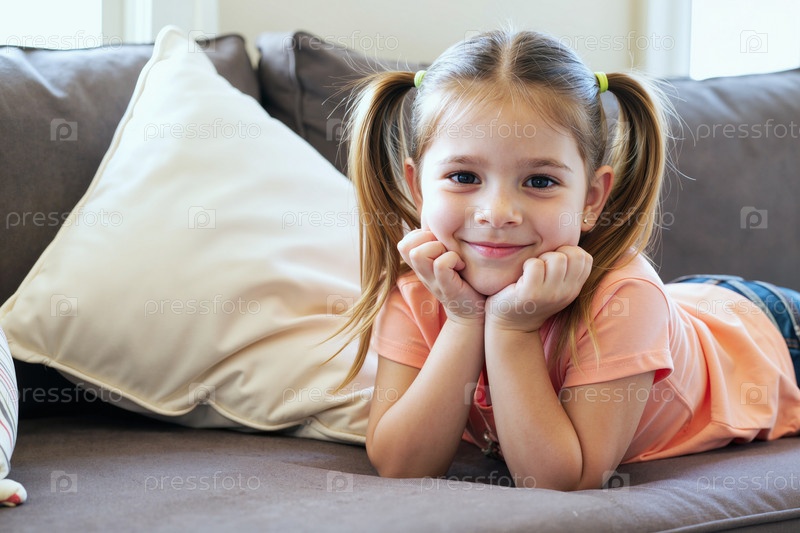 Портрет белокожей девочки-ребенка, улыбающейся, лежа на диване в помещении
