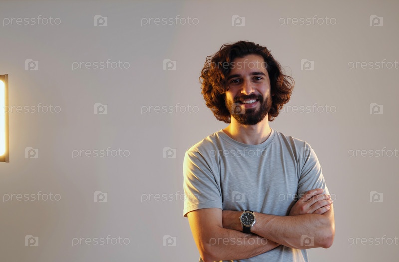 Портрет молодого взрослого белого мужчины, улыбающегося с перекрещенными руками в помещении