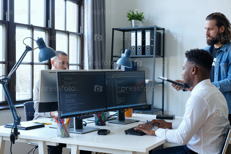 Молодые взрослые мужчины сотрудничают над проектом по разработке программного обеспечения в современном офисе