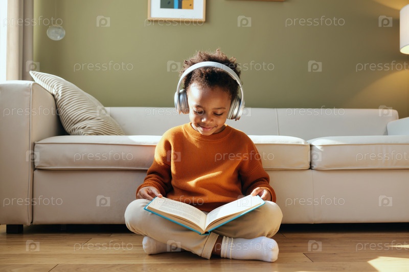 Черный ребенок сидит на полу, читает книги и слушает музыку в помещении