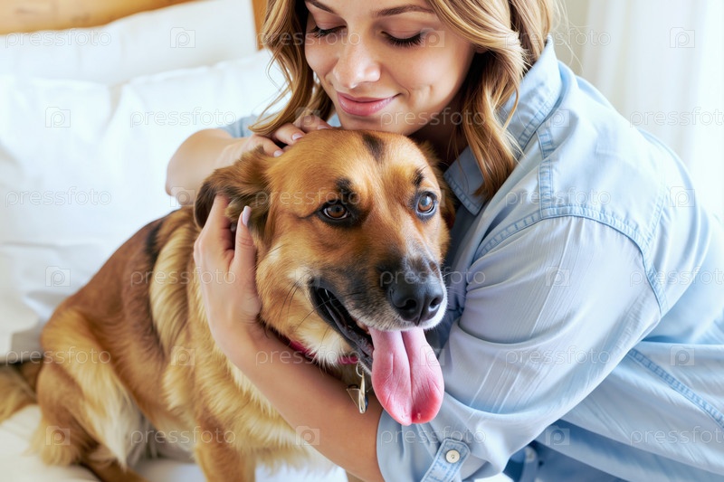 Молодая кавказская женщина обнимает собаку, улыбаясь внутри на кровати