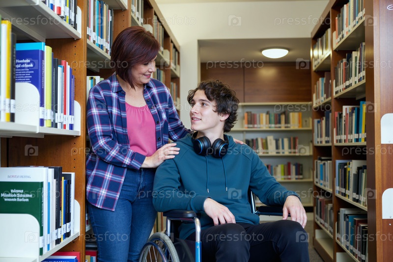 Белая женщина средних лет поддерживает мальчика-подростка с инвалидностью в библиотеке