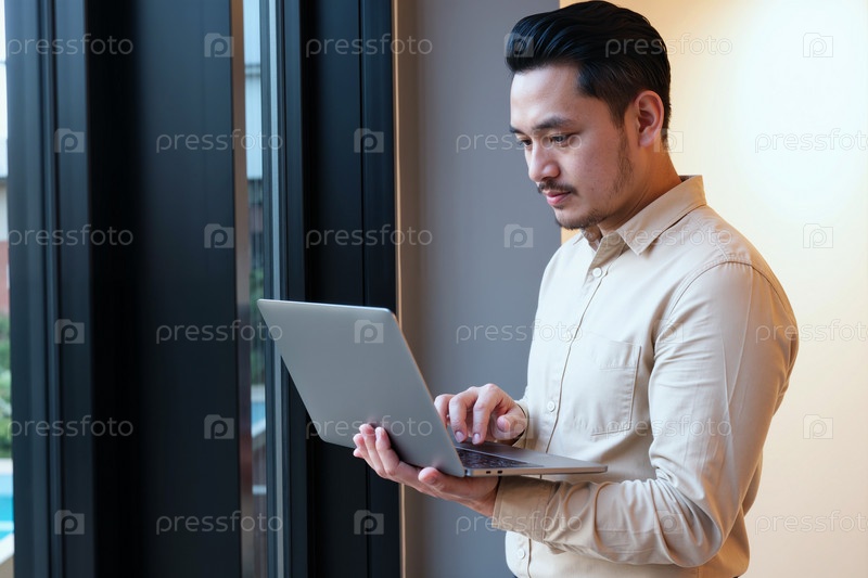 Молодой взрослый азиатский мужчина использует ноутбук-компьютер, стоя возле окна в помещении