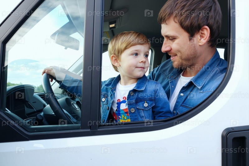 Белый молодой отец улыбается белому ребенку, притворяющемуся водителем автомобиля