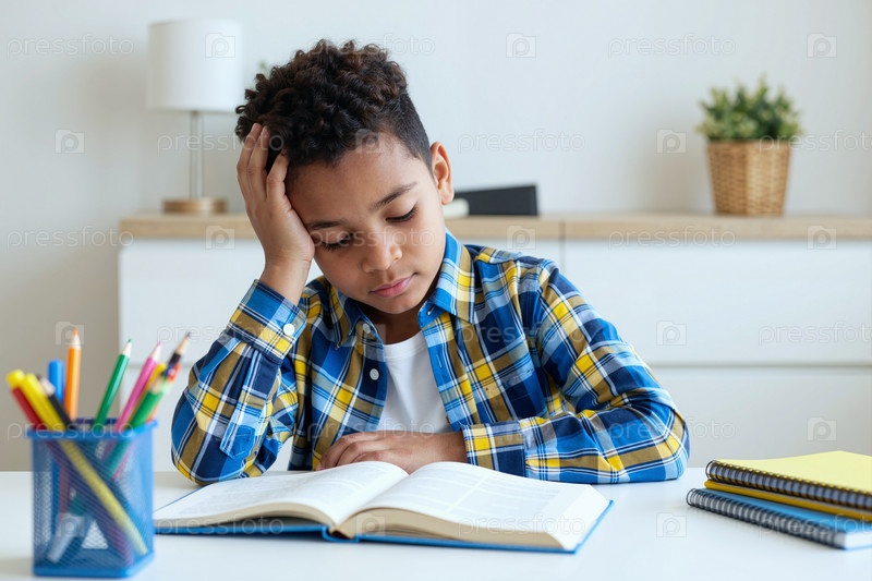 Претиенный чернокожий мальчик изучает домашнее задание, сидя за столом в современной комнате
