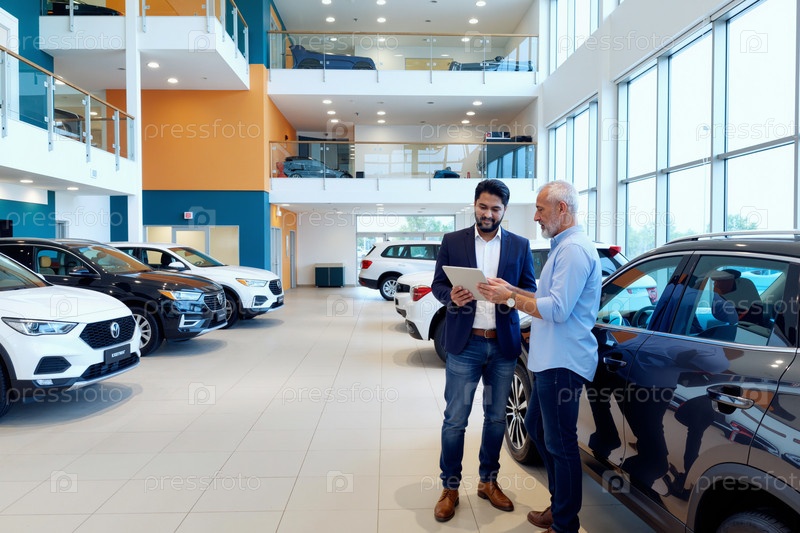 Кавказский мужчина средних лет консультирует молодого взрослого южноазиатского мужчину в автосалоне