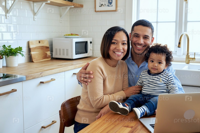 Портрет молодых мультиэтнических родителей, улыбающихся в то время как они держали своего маленького сына внутри