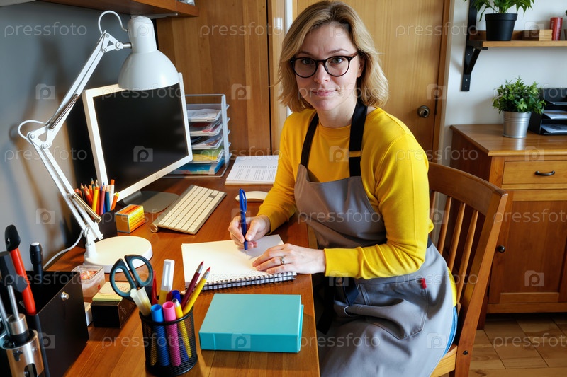 Портрет молодой взрослой белокожей женщины, пишущей записки на столе домашнего офиса