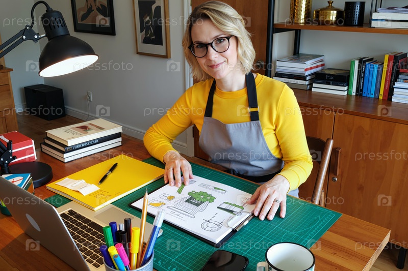 Портрет белокожей молодой взрослой женщины, разрабатывающей дизайн интерьера на рабочем столе