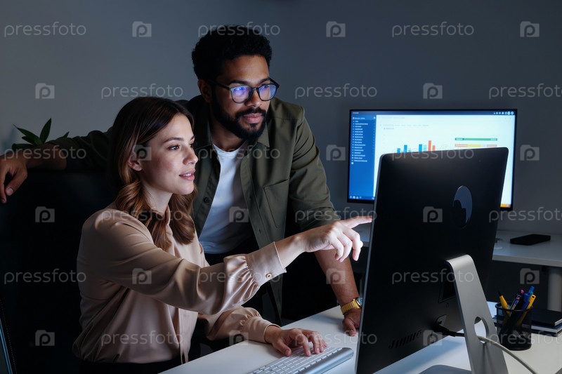 Юная кавказская женщина и молодой чернокожий мужчина анализируют данные на экране компьютера