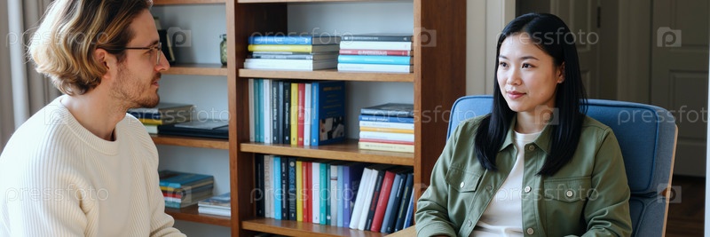 Молодой человек разговаривает с молодой азиатской женщиной во время консультации