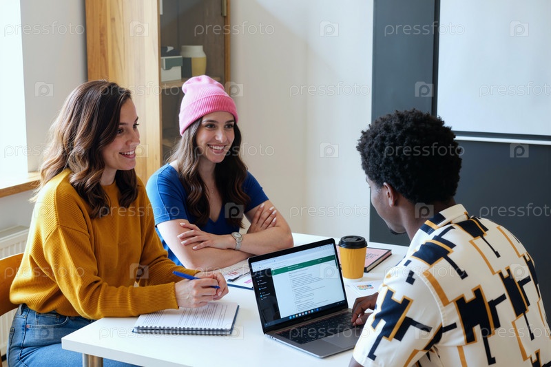 Молодые женщины и чернокожие сотрудничают во время офисной встречи