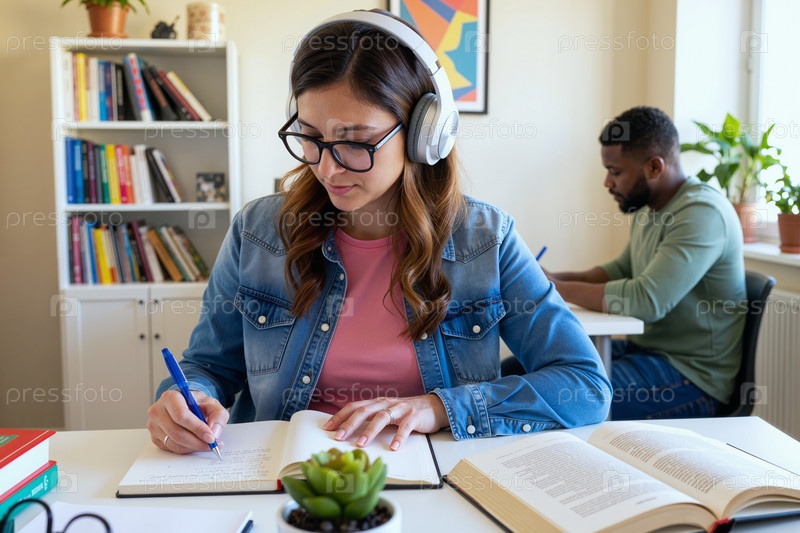 Молодая женщина учится с наушниками, пишу в блокноте