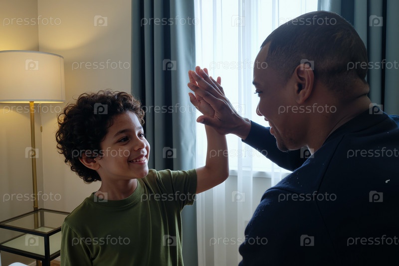 Мальчик и чернокожий мужчина улыбаются и дают пять в помещении