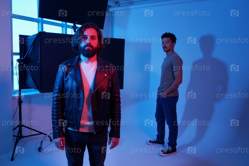 Молодой человек стоит в студии, пока молодой мужчина позирует