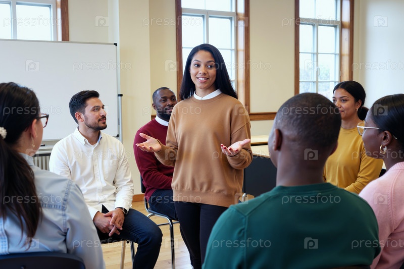 Молодая чернокожая женщина ведет групповую сессию терапии с различными взрослыми