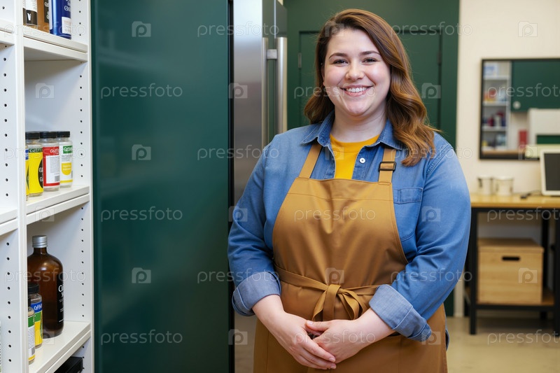 Портрет юной женщины, улыбающейся в современном кухонном рабочем пространстве