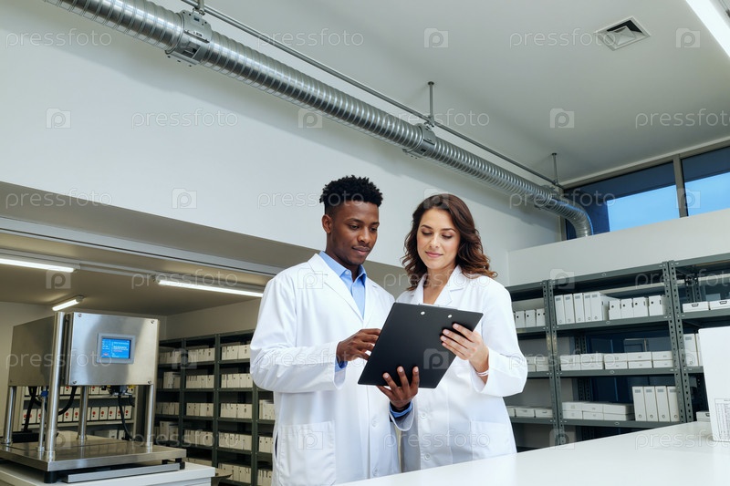 Молодая женщина и молодой чернокожий мужчина сотрудничают в современной лаборатории