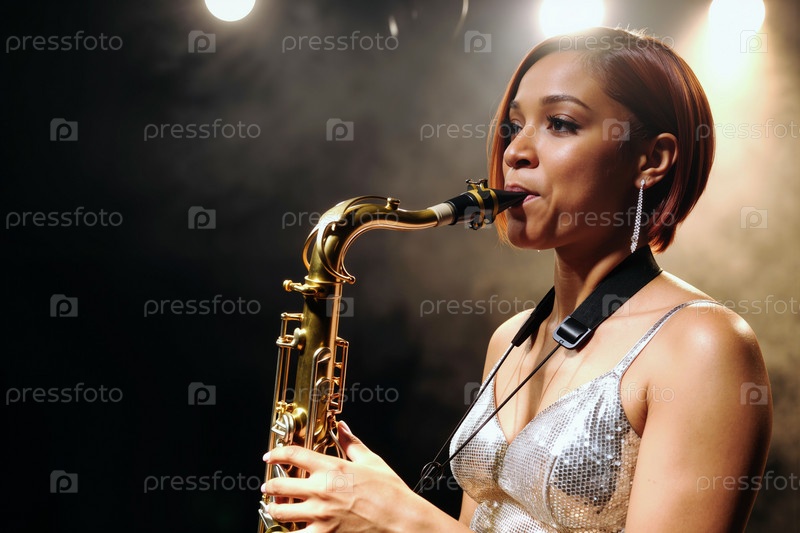 Молодая черная женщина играет на саксофоне на сцене под драматическим освещением