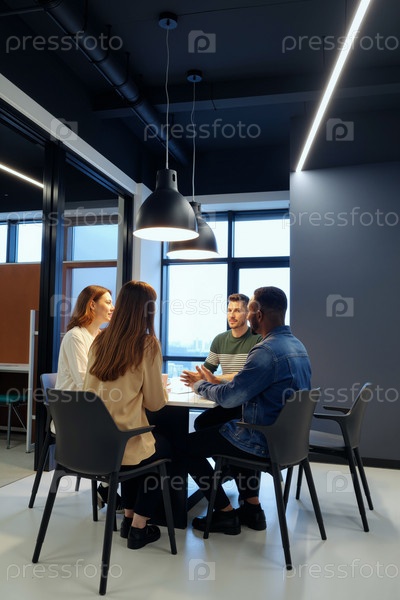 Мультиэтнические молодые взрослые участвуют в мозговом штурме Сеанс вокруг стола