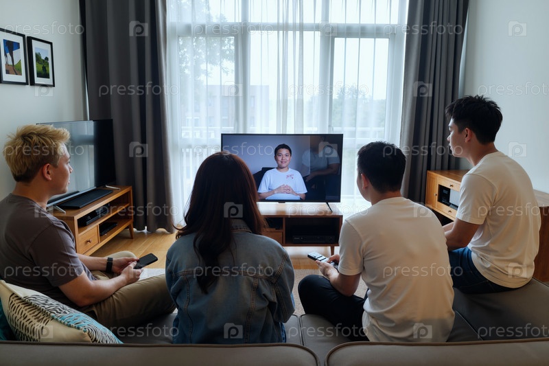 Группа молодых азиатских друзей, смотрящих телевизор и использующих смартфоны