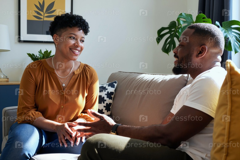 Черная женщина улыбается, слушая молодого чернокожего мужчину