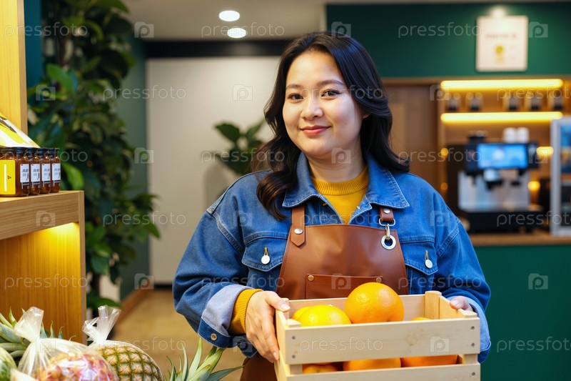Портрет молодой азиатской женщины, держащей коробку с апельсинами в продуктовом магазине