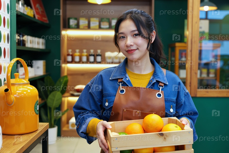 Портрет молодой азиатской женщины, держащей деревянный ящик с свежими апельсинами