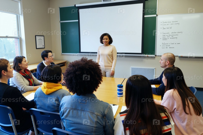 Молодая чернокожая женщина ведет встречу с разнообразной командой слушателей